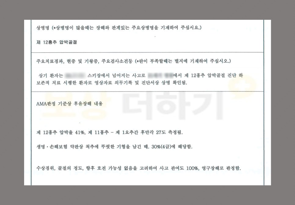 흉추 12번 압박골절 S22070 진단 후 보존치료받으신 B 님의 후유 장해는 압박률, 척추의 기울어짐에 따라 평가합니다. 압박률이 얼마인지, 척추가 앞, 뒤, 옆으로 얼마나 기울어졌는지에 따라 장해 지급률이 결정됩니다. 또한 이 지급률은 받을 보험금에 영향을 주기 때문에 올바른 장해 평가가 중요합니다. ↓보험약관 규정에 따라 AMA 방식의 평가를 받았고 이러한 의사의 소견과 의학적 근거에 기초하여 보험금 산정을 하였습니다. 보험사의 심사를 거쳐 최종 4,600만 원 이상의 후유 장해 보험금 지급받으셨습니다.