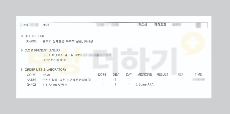 엑스레이, MRI 촬영 등 정밀검사를 하여 제1 요추압박골절 (L1, S32090) 진단이 나왔습니다. 이에 따라 보조기 착용을 하시면서 침상 안정을 취하라는 소견을 받으셨어요.