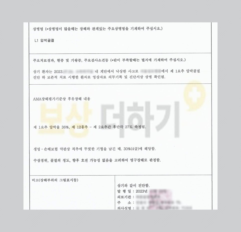 중년, 노년 여성의 많은 분들은 골감소증, 골다공증을 겪고 있어 척추 압박골절 부상도 빈번히 일어납니다. 하지만 남성, 젊은 층에서도 이러한 위험은 피해 갈 수 없는데요. 넘어짐 사고, 교통사고 등으로 외부로부터 크게 충격을 받으면서 척추 골절이 발생하는 일이 많기 때문입니다. 그중에서도 허리 즉 요추압박골절 되었을 때는 상해 보험금 얼마나 받을 수 있을까요? 실제 사례를 통해 말씀드리겠습니다.