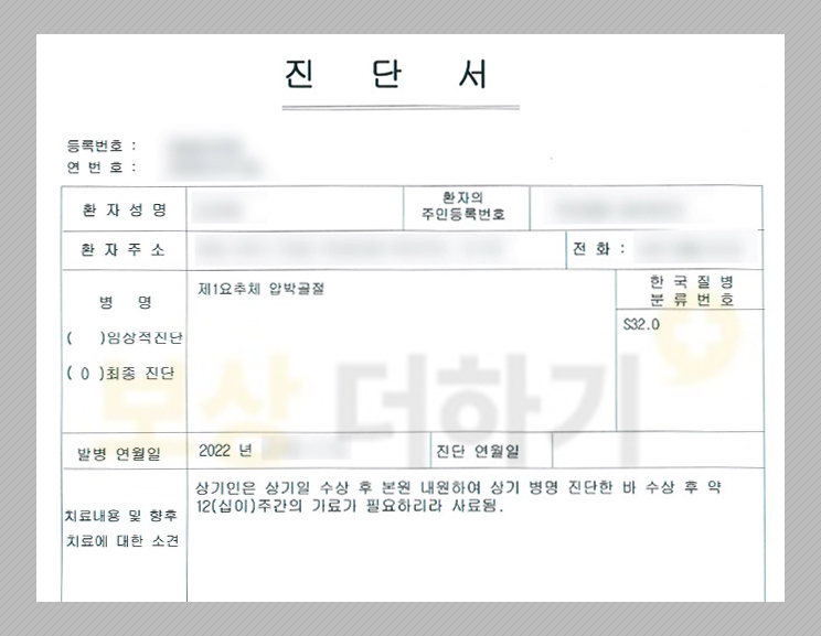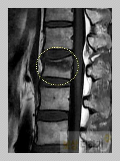 제1요추체 압박골절 S32.0 즉 허리뼈를 가리키는 요추 1번을 다친 것으로, 척추체가 위아래로 압박되어 그 높이가 낮아지는 형태의 골절이었습니다. 사례자분은 수술이나 시술 없이 보존적 치료를 받으셨습니다. ▼ 요추 1번 압박 골절