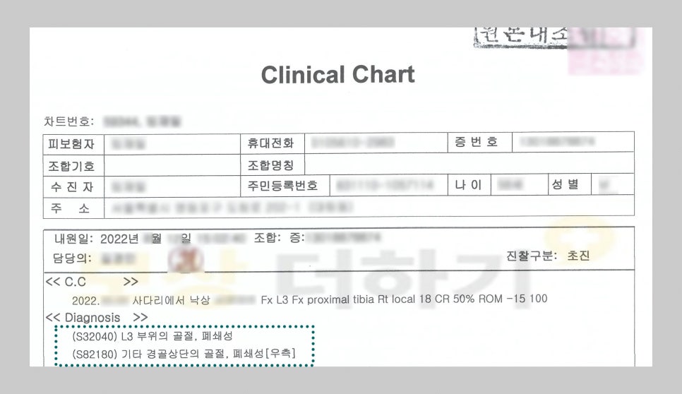 ● 검사 결과 * L3 부위의 골절 S32040 * 경골 상단의 골절 S82180 허리 뼈인 요추 3번과 경골 상단 즉 무릎 골절이었습니다.