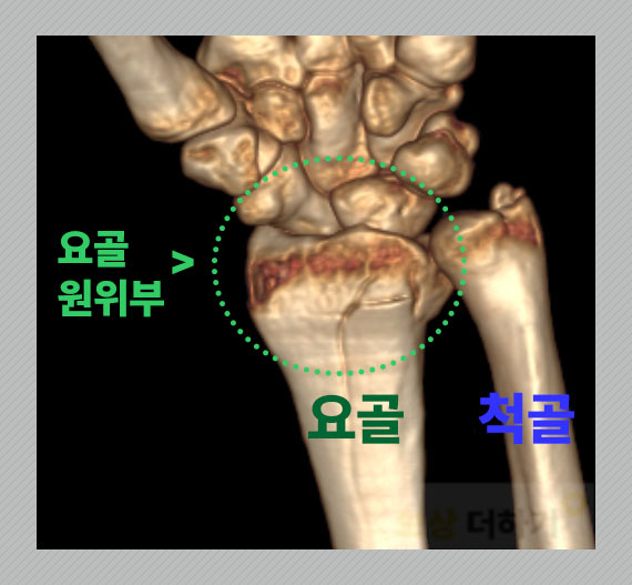 손을 짚으며 넘어졌는데 붓기와 통증이 생기셨다면 정형외과에 가서 정확한 검사를 해보셔야 합니다. 정밀 검사 결과 원위 요골 골절 진단을 받으셨나요? 조금 생소할 수 있는 용어인데요, 그 위치를 살펴보면 다음과 같습니다.