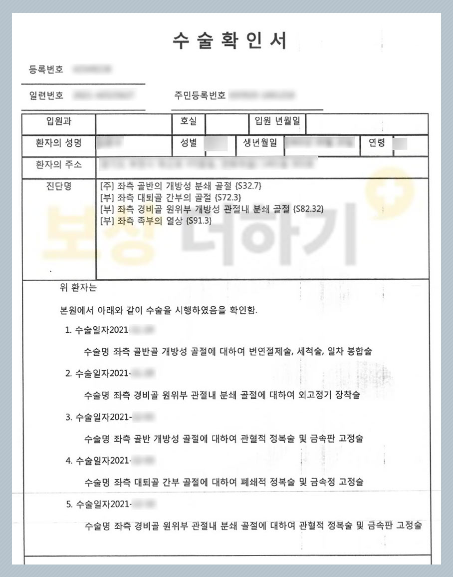 위와 같은 끼임 사고로 인해 왼쪽 하반신을 전체적으로 다치셨습니다. [진단명] · 골반 개방성 분쇄 골절 · 대퇴골 간부 골절 · 경비골 원위부 개방성 관절내 분쇄 골절 등 즉 골반, 허벅지, 발목 골절로 이해할 수 있어요.
