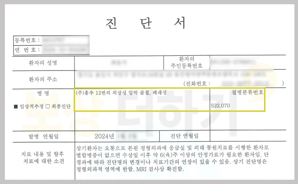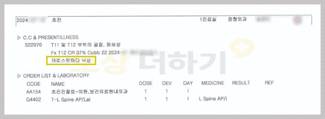 ▶흉추12번 압박골절 (S22.070) 비수술 보존 치료 X-ray, MRI 촬영 결과 등뼈인 흉추 12번의 압박 골절이었습니다. 흉추 12번은 허리 뼈인 요추 바로 위에 있어서 사고 이후 허리 통증을 많이 느끼셨어요. 하지만 다행히 심각한 상황은 아니라 보조기 착용을 하고 경과를 지켜보게 되었습니다.