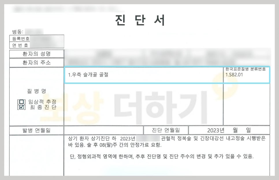 천안의 김 00 님은 단독 교통사고에 의해 무릎에 심한 부상을 입게 되셨습니다. 정확한 진단명은 우측 슬개골 골절이며 한국 표준 질병 분류번호는 s8201입니다.