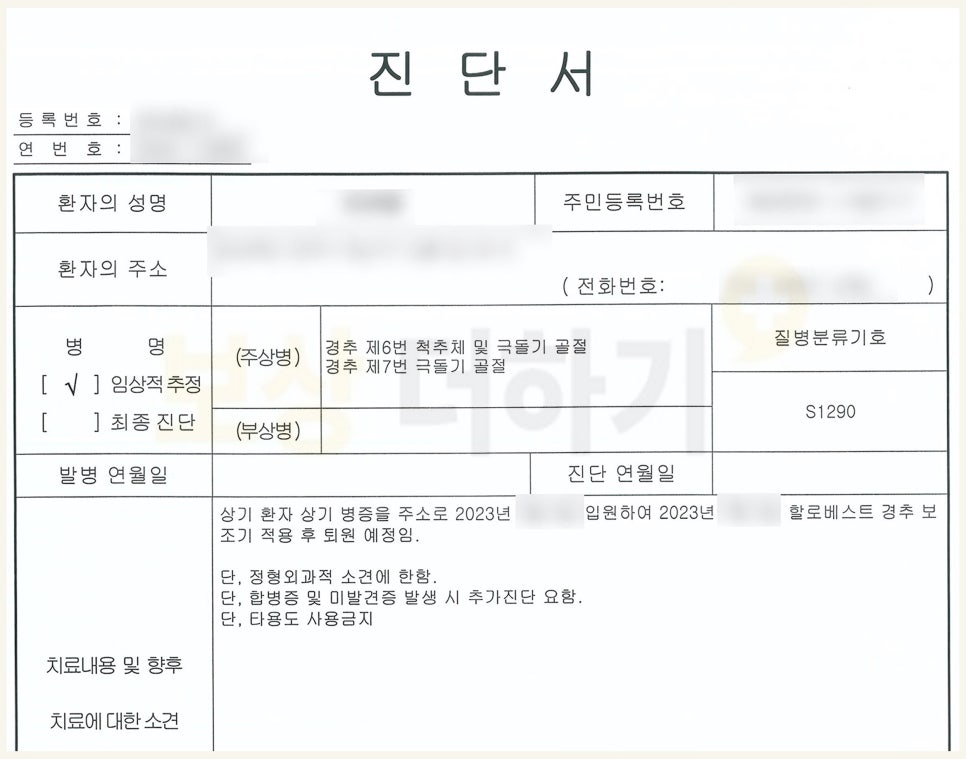 서두에서 말씀드린 사례자분입니다. 조 00 님은 친구분들과 휴가를 즐기던 중 사고를 당하셨어요. 수영장에서 다이빙을 할 때 수직으로 목이 부딪히면서 벌어진 일입니다. 당시에는 통증을 느끼셨지만 다음날이 되자 괜찮아지셨다고 합니다. 하지만 고개를 위아래로 움직일 때 뻐근함, 왼쪽 어깨 뒤쪽으로 저린 느낌 등이 있었습니다. 결국 내원하여 정밀 검사를 받으셨고, 경추 6번 골절 S1290 진단이 나왔습니다.