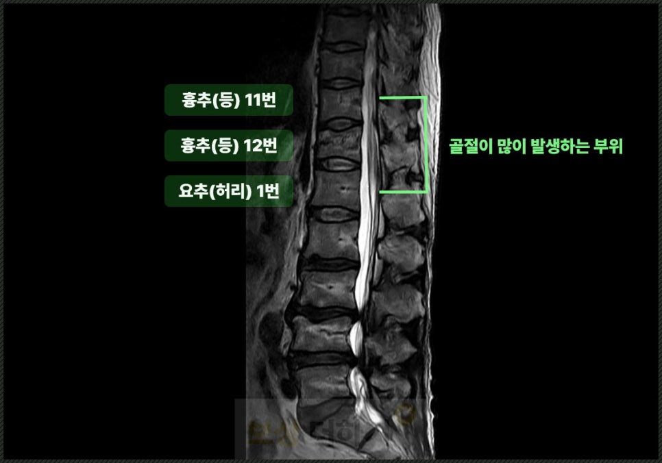 특히 흉추 11번, 12번 및 요추 1번은 골절이 많이 발생하는 부위이기 때문에 이곳에 척추체 성형술 하신 분들이 많으실 거예요.