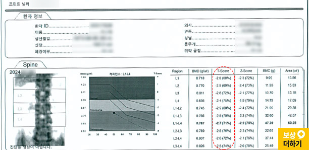② 골다공증 및 사고기여도 대응 이번 환자분께서는 사고 이전에 이미 T 점수 -2.9의 골다공증 진단을 받으신 상태였습니다. (T 점수 -2.5 이하면 골다공증)