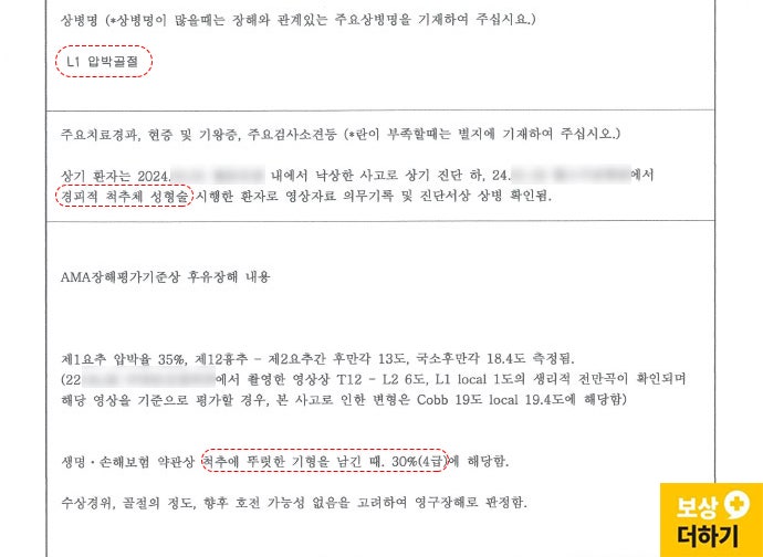 ① 정확한 후유장해진단서 발급 같은 척추 골절이라도 주치의마다 측정 방식이 다르면 압박률이 25%가 나올 수도, 30%가 나올 수도 있습니다. 단 몇 %의 차이로 지급률이 10%에서 20%로 달라지기 때문에, 환자에게 유리한 방식으로 정확하게 측정하는 것이 매우 중요합니다.